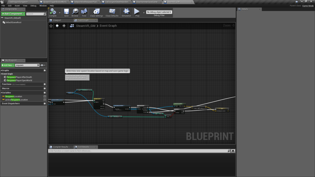 When the player dies, it gets to this section of logic in the function “RespawnPlayerOpenWorld”. It loops through all the possible respawn objects and gets the one that’s equal to the highestTPNum from the save game. When the player completes one of the puzzles on the levers, then it saves this to a higher number.