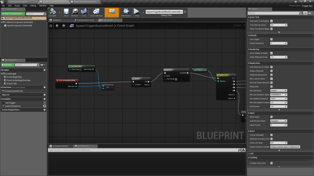 This part is easy-we put some trigger boxes (green squares) and each time the player overlaps with them, we have them spawn enemies. We implement a do once node, and if the player dies we should reset this node as part of the death sequence so enemies can spawn again: we’ll get to this later.