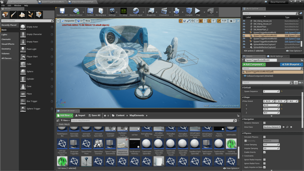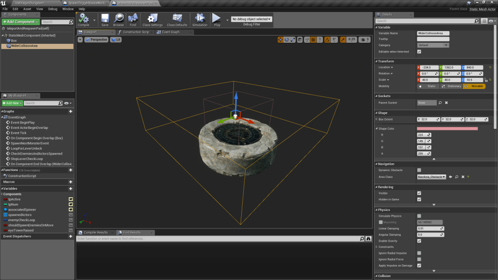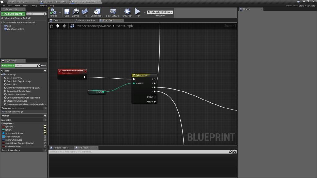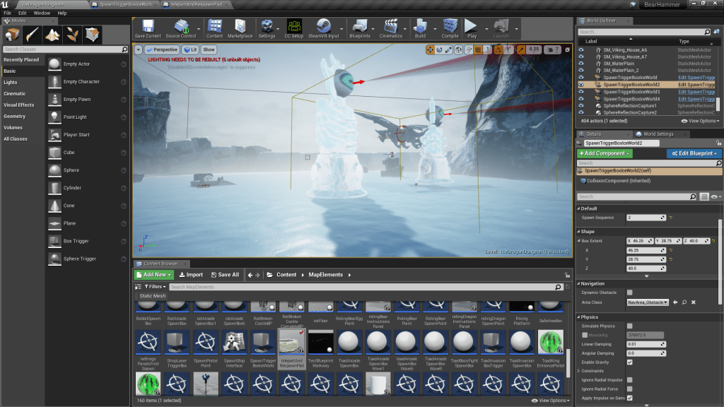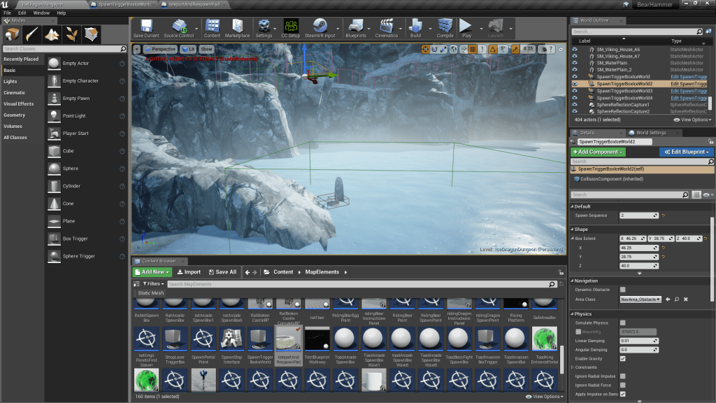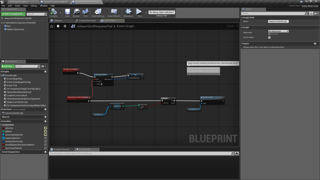This loop is activated after spawning monsters. All monsters spawned or other classes associated with monsters (such as the big spawn portals we create) are added to this array of spawnedActors. Every 0.5 seconds we check if this array is count 0, if not we assume the player has not finished this sequence. If it does tick down to 0, then we destroy the ice cube component of our lever class. TODO: need to draw more attention to this, make sure it’s clear for player they have to go to the lever after they’ve cleared the enemies.