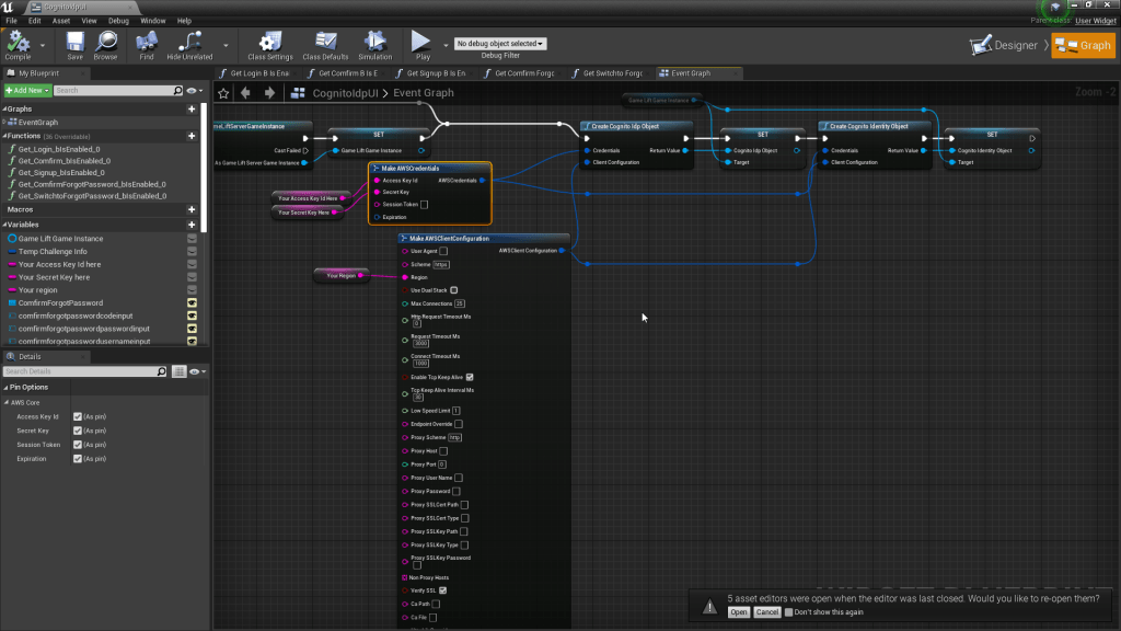 - The UE4 client has access to amazon IAM credentials for logging in users via cognito. On Amazon, this IAM credential must be restricted to only cognito logins to not allow someone who has access to this information