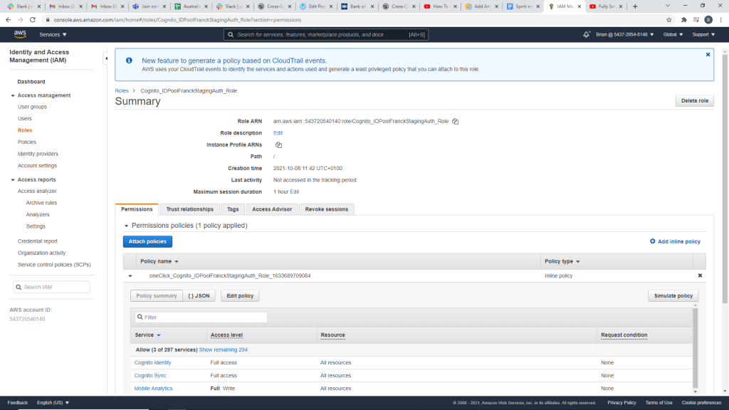 Reviewing what was set up previously, I believe I set this up to be tied to this particular role Cognito_IDPoolFranckStagingAuth_Role, that must have been set up earlier when setting up the user, the policy, and linking the user to the userPool.