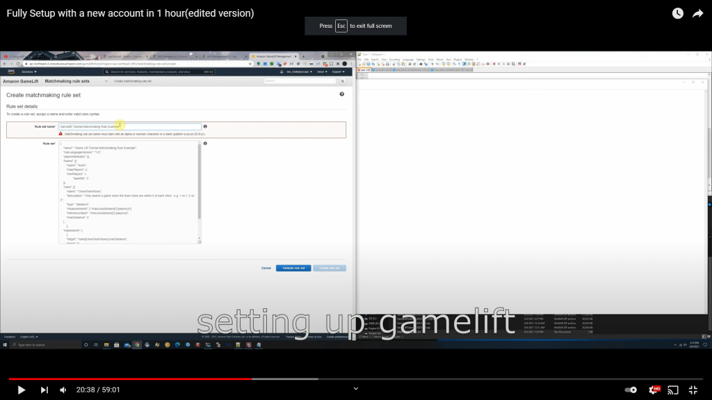 The tutorial video shows assigning a matchmaking rule set as part of the gamelift setup. We currently do not have that configured.