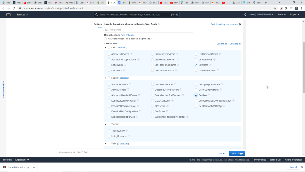 Now we have enough to finish creating the policy, reviewing the access and naming it cognito_user.