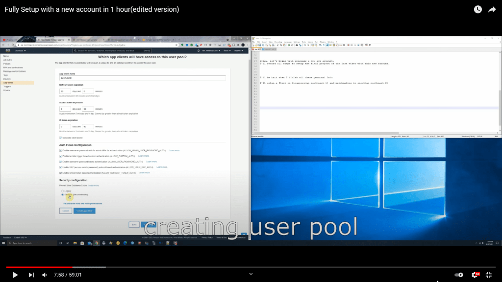The last step gets into some specifics of which app the user pool connects to and options for auth flows configuration.