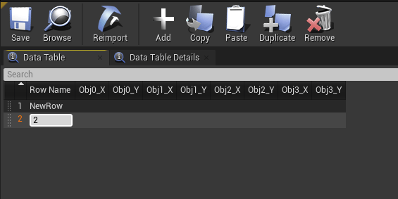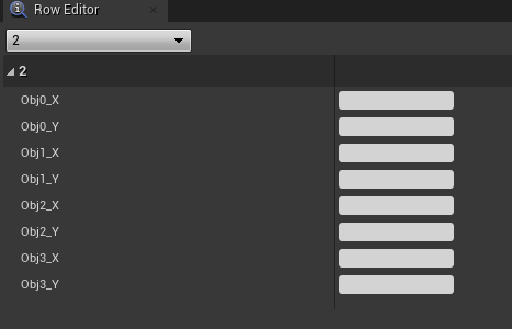 A data table based on STargetTrackRow is one or more sets of these eight strings. Each row represents a time step. Each pair of columns (e.g. Obj0_X and Obj0_Y) represent the co-ordinates of an object to be spawned at that time.
