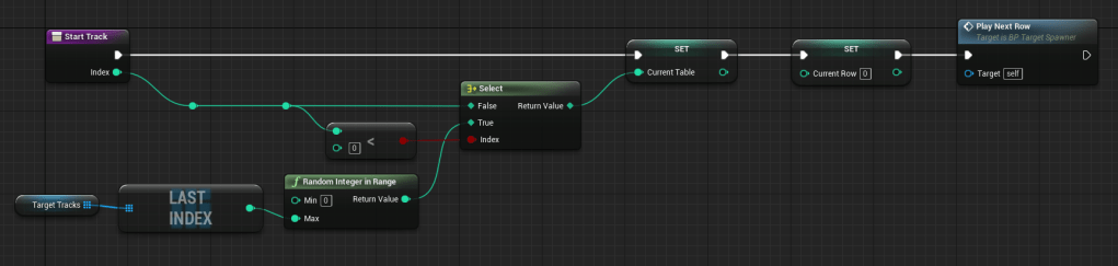 SpawnObject spawns an actor class indexed in TargetObjects at a relative position within the spawn area. It is called by PlayNextRow. PlayNextRow also makes use of GetCurrentTrack, GetCurrentRow and GetCurrentTrackLength which are used to read the specified data table and provide the co-ordinates. When finished PlayNextRow calls the event WaitForNextRow, which re-calls PlayNextRow after a delay, unless the end of the table has been reached.