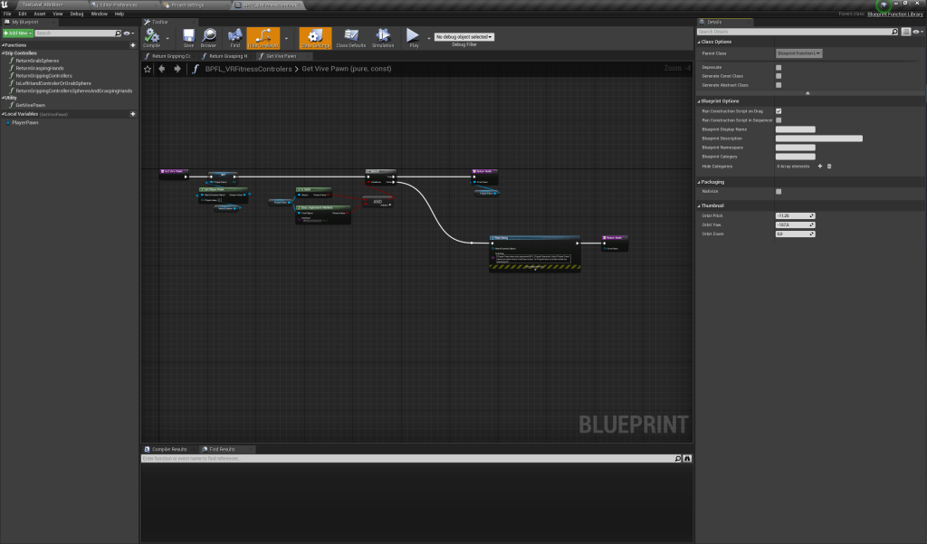 - ReturnGrippingControllersSpheresAndGraspingHands – Returns all objects related to VivePawn hands. Grab Spheres, Grip Controllers and Grasping Hands. You can either provide a GripController or GrabSphere. Toggle between using bUseGripController. Providing a valid Player blueprint is preferable but the function has a fallback for it.